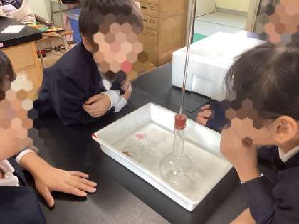 冷たい水と熱い水では、中の空気はどのような変化をするかを見比べ、管に詰めたゼリーが外に飛び出したり、ビーカーの中に落ちたりする様子にとても驚いていました。目に見えない空気にはさまざまな性質があることを実験を通して学ぶことが出来ました。