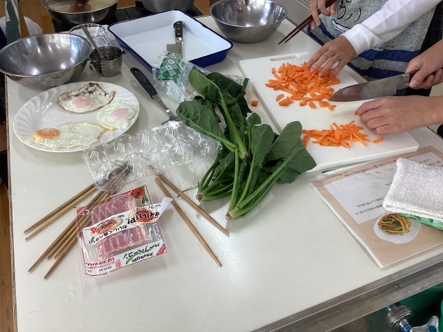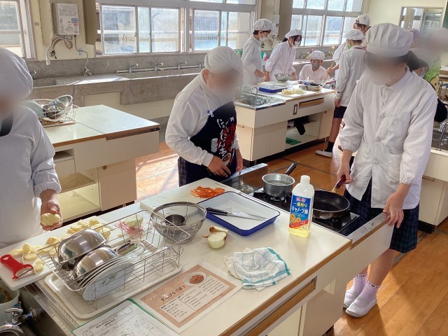 今週の1,2時間目を使い調理実習を行いました。献立は自分たちが好きなものだけでなく、栄養のバランスも考えて各班で立てました。調理台の上には、じゃがいも、たまねぎ、ほうれんそうにベーコン、卵等色とりどりの食材があり、給食でも登場する「ジャーマンポテト」が人気のようでした。互いに協力しながら、美味しく出来上がりました! 授業だけでなく、お家でも一緒に作ってもらえると嬉しいです。