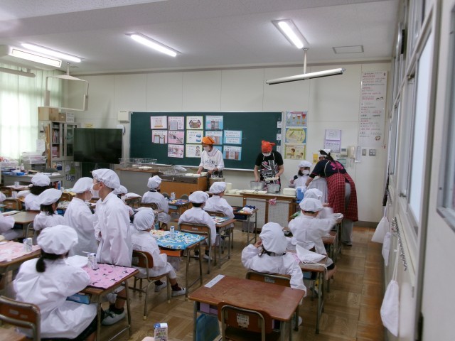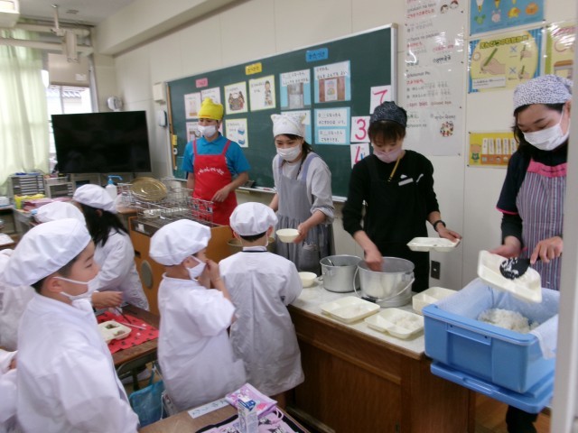 新学期がスタートしました。新1年生の皆さん、ご入学おめでとうございます。入学祝い献立は、1年生の入学祝いと在校生の進級祝う行事献立です。子どもたちに人気のカレーライスに一口とんかつを添えて、フルーツゼリーもついていました。毎日給食を作って下さる、調理員さんに感謝の気持ちを込めて食器や食缶を返却する時に「ごちそうさまでした!」と大きな声で言っています。