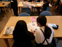 5年生が総合百科事典「ポプラディア」を使って、ビンゴのマスに書かれている言葉をペ...