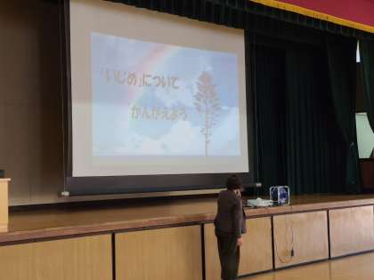 校長先生からは、「自分をいじめること」についてお話がありました。「自分を大切にすることは、周りの友達を大切にすることにつながる」といじめを起こさないためには、自分のことをしっかりと見つめていくようにとのお話でした。
