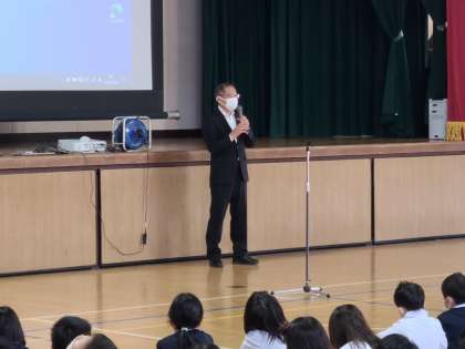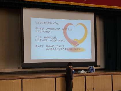 まず、人権担当の別所先生から、「いじめとはどんなことなのか」から「いじめは絶対にダメ」なことであり、もしいじめられていると感じたら、すぐに周りの人に相談しようとお話がありました。