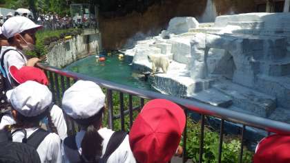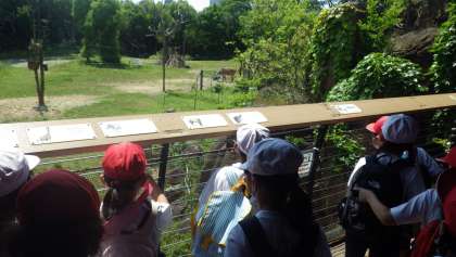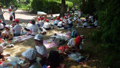 動物園の中にあるサファリでは、間近にキリンを見て「大きいねぇ」と感嘆の声が聞かれました。みんな興味津々で、各ブースを回っています。サファリの見学の後はいよいよ待ちに待った昼食タイムです。みんなで木陰に入ってシートを並べます。しっかりと見学したのでみんなおなかはペコペコです。持ってきたおやつも楽しみです。