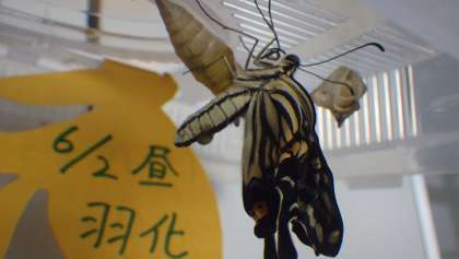 今朝7時30分ごろ、最後の蝶の蛹が羽化しました。見る間に羽が伸びていきます。