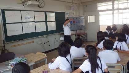 今日は校長先生から6年生へ、特別授業がありました。「まなボード」という教材を使って、グループで相談しながら考えを出し合い、まとめ、発表する学習です。