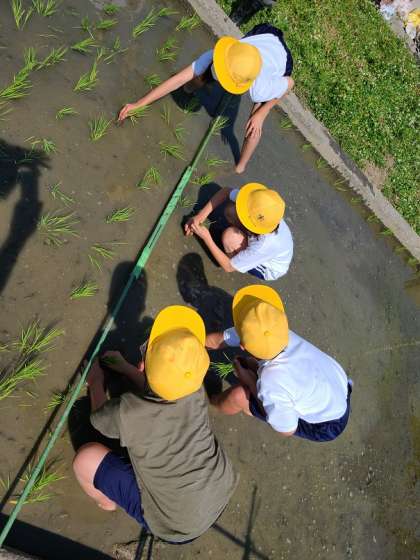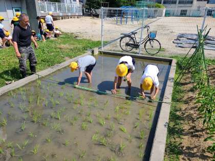 6月9日(木)5年生は、第2校地にある田んぼに行き田植え体験を行いました。田島小学校の時からお世話になっている民生委員の塩川さんのサポートで、はだしになって田んぼに入り田植えをしました。「思ったより水が温かい」「気持ちいい」など、児童の声も聞こえ、貴重な体験ができました。塩川さんいつもありがとうございます。