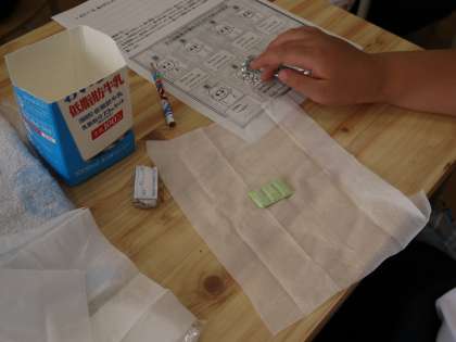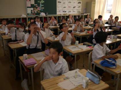 4年生はフッ化物洗口をしました。先生から説明を聞いて、ブクブクうがいをします。フッ化物でブクブクうがいをすると、永久歯のむし歯予防になります。キシリトールガムで日頃どのくらい嚙むことができているかを確かめることもしました。