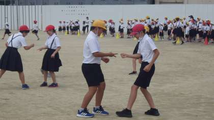 先週は雨でできませんでしたが、今週はたてわり班で児童集会ができました。今週は先週できなかった「じゃんけんドン」をしました。向かい合った班で、先頭の人が駆け足で出発し、出会ったところでじゃんけんして、勝ったら相手の班に近づいていく遊びです。1年生にとっては初めての体験になる人もいて、高学年が教えてあげながら遊びを楽しむ場面もありました。