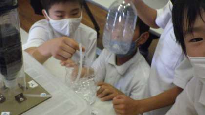 施設見学の後は、実際に水をきれいにする実験をしました。初めは濁った水が、砂を使ったろ過器で透明な水になっていくのを体験しました。その水を青色に染色して、活性炭の層でろ過するとさらに透明になります。みんな驚きで歓声が上がっていました。また、オゾン発生器を使ってオゾンで水をきれいにする実験も見せてもらいました。