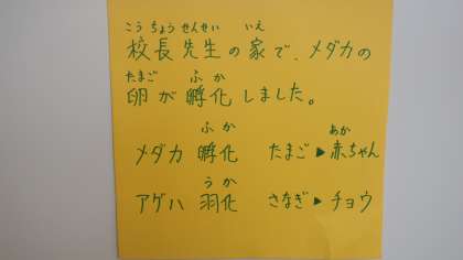 校長先生が、おうちで孵化したメダカを持ってこられました。今は本当に小さい子メダカですが、これから大きくなってくれると思います。学校にまた新しい仲間がやってきました。優しく見守ってくださいね。