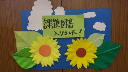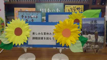 課題図書の飾りも夏らしく、青空、白い雲、ひまわりと