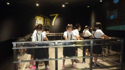 4年生が社会見学で、あべのタスカル(阿倍野防災センター)に行きました。天王寺から地下道を抜けて、防災センターに到着です。1組・2組に分かれて、順番に体験していきます。最初に、震度7の体験をしました。しっかりと説明を聞いて、体験の装置に乗りました。