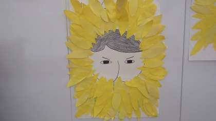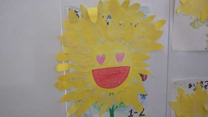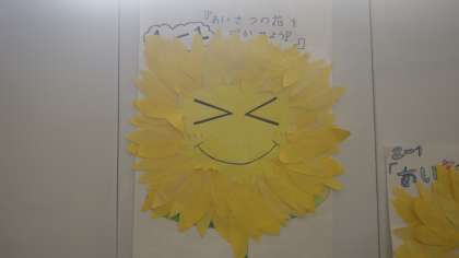 月曜日の児童朝会で紹介した「あいさつの花」が靴箱前に掲示されています。本当にたくさんの花びらが集まって、立派なひまわりが咲いています。13の花が壁一面に貼られているのはとても迫力がありますね。