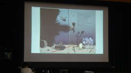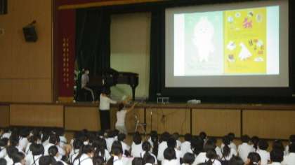 次に別所先生から「戦争が町にやってくる」という絵本の読み聞かせがありました。穏やかで平和な町ロンドにはそれぞれ素敵な個性を持った仲良し3人組が町の人と仲良く暮らしていました。