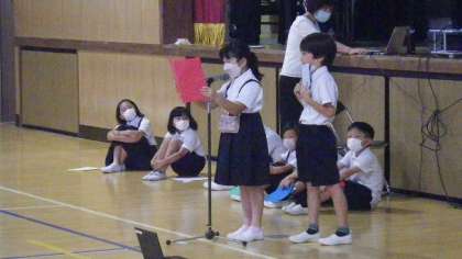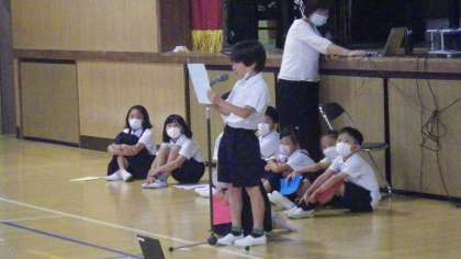 2年生は絵本「おこりじぞう」と「つるにのって」で学んだことを発表します。