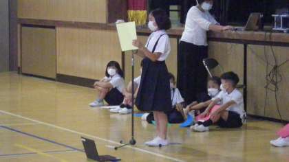 5年生は絵本「鉄砲を持ったキジムナー」と「かんからさんしん」で沖縄での地上戦について学習したことを発表しました。