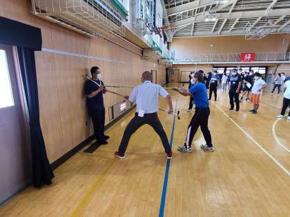 次に、不審者が侵入したことを想定した訓練を行いました。大阪府警の方から不審者対応についてのお話や、さすまたの使い方を教えていただきました。