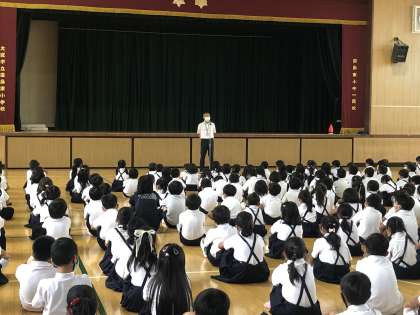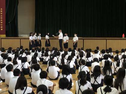 校長先生からは、1学期終業式で「夏休みだからこそやりたかったことをしてください」というお話をしましたが「夏休みの思い出ができたよ」という人は、ぜひ担任の先生にお話ししてくださいとお話がありました。また、工事をしていたサブグランドがもうすぐ完成し、次は、メイングランド工事に入り、不便な生活が続きますが、不便な中で生まれた工夫は、環境が整ったときには大きな強みになるというお話もありました。