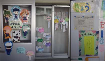 給食室前の掲示が新しくなりました。涼しげな風鈴やかき氷のイラストなどいつもきれいで楽しい掲示をありがとうございます。