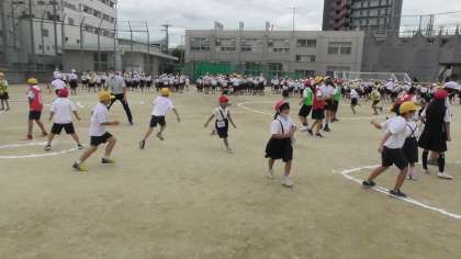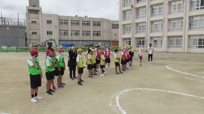 今日の児童集会は「島おに」です。運動場に引いた安全地帯の「しま」を渡りながら、オニを避けてゴールに向かう遊びです。