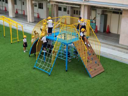 1時間目は、1年生。遊具での安全な遊び方の説明を聞いた後、コンビネーション遊具、うんてい、のぼり棒、鉄棒、ふかふかの人工芝の上で遊びました。