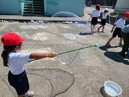 9月12日(月)1年生が生活科の学習の一環でシャボン玉つくりをしました。ストローだけではなく、様々な用具を使ってシャボン玉を作りました。ロープを使って大きなしゃぼん玉つくりに挑戦する姿も見られました。また、おうちでもお話を聞いてみてください。