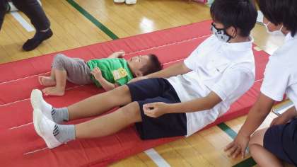 それぞれ発達段階の違う赤ちゃんたちを前にして初めは緊張している様子でしたが、一日の過ごし方や生まれてからの成長の過程をお母さんから話していただくうちにみんな表情が和んできました。手形や足形を自分たちと比べて、「ちっちゃいねぇ」と感心したり、寝返りをしようとがんばる様子に思わず「がんばれ」と声援が出たり。ジャンプが好きな赤ちゃんの様子をほほえましく見守ったり。とっても元気な赤ちゃんの様子に6年生のみんなは「かわいい!」「元気だね!」とわくわくしながらも、穏やかな雰囲気の中で、交流することができました。。