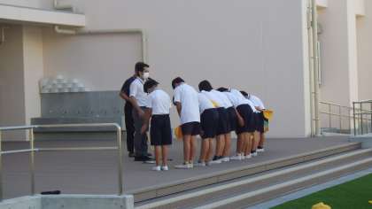 監護当番の先生からの指示で、しっかりと並んで朝会が始まります。