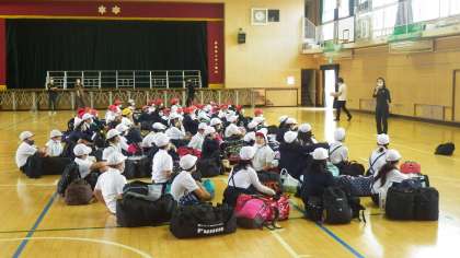 今日から3日間、5年生は神鍋高原で過ごします。天候はあまりすぐれませんが、9時15分、出発式が始まりました。司会の人がしっかりと進行しています。