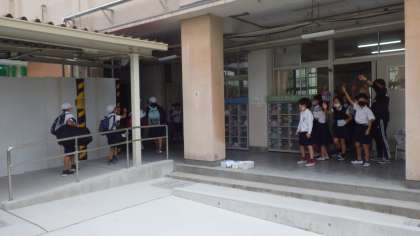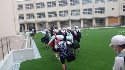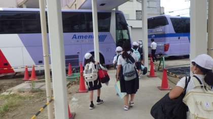 バスに向かう途中、1年生・2年生から「いってらっしゃい!」と見送りの声がかかりました。出発する5年生は、笑顔で「行ってきます!」と返しています。