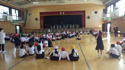 体育館では、じゃんけん列車をしました。音楽に合わせてジェンカのステップを踏んで移動します。だんだんと列が伸びて、先頭の人もつながっている人も次はどうなるのか楽しみにして進んでいきます。