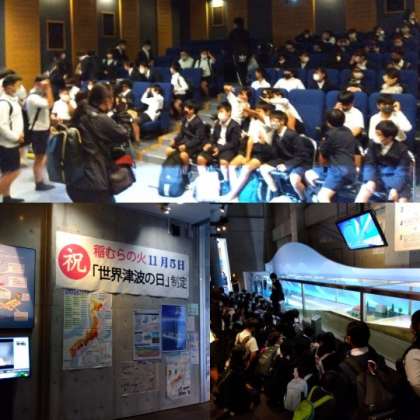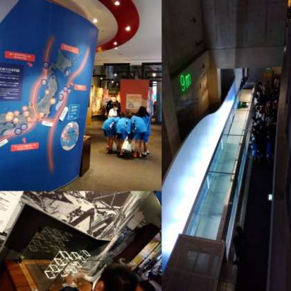 最初にシアターで3Dの映像資料を見てから、自由見学で防災について学習しました。この日は、和歌山県の中学生も学習に来館していました。