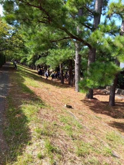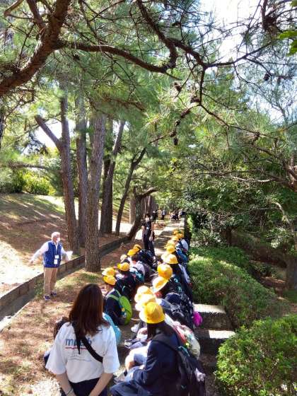 館内見学の後は外に出て、語り部さんの案内で、広川堤防を実際に歩きながらお話しを聴きました。濱口梧陵さんが私財を投じて村人とともに築いた広川堤防は、その後の津波から村を守りました。