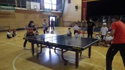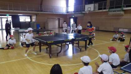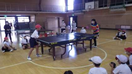 担任の先生も交じって、卓球を楽しみます。子ども達には優しく教えてくださっていた選手も、先生相手には少し本気でラリーをして、見ているみんなも盛り上がりました。