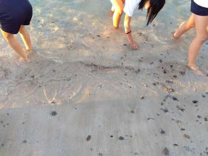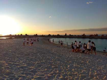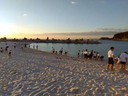 夕景の白良浜で波と戯れる。