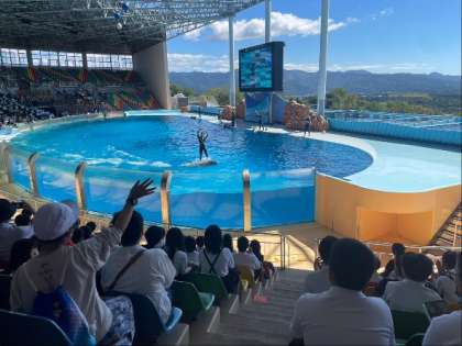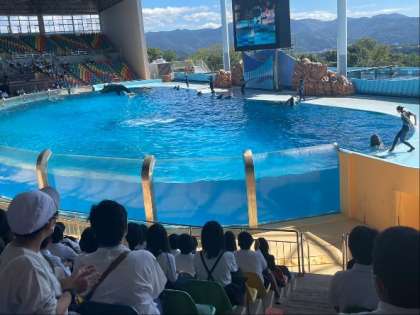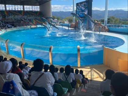 安全確認を兼ねて、一旦ビッグオーシャンに集まってイルカショーを見ました。