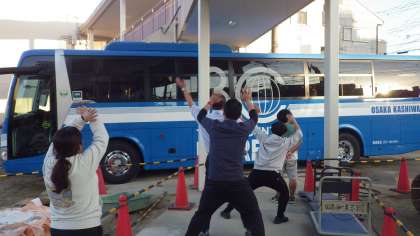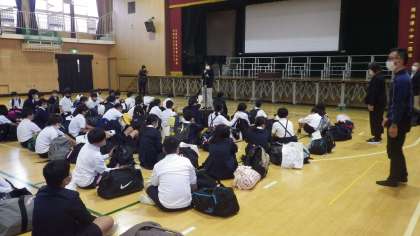 無事学校に到着し、先生方がお出迎えです。体育館で帰校式を行います。