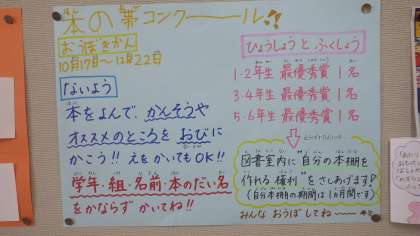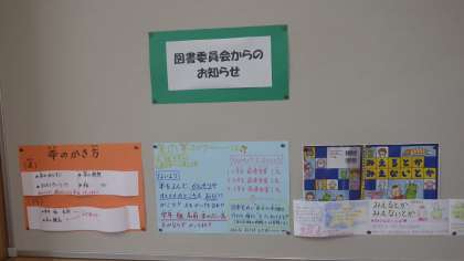 図書委員会で、みんなに本を読むきっかけになるような取り組みが進められています。入口すぐのところの掲示板に「本の帯コンクーーール」について掲示されています。