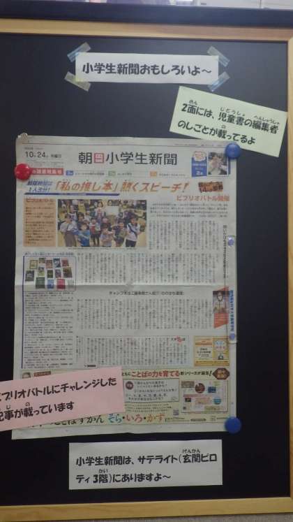 またカウンター前には、ビブリオバトルという本の紹介を競い合う競技の記事を取り上げた小学生新聞が掲示されています。