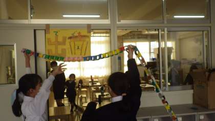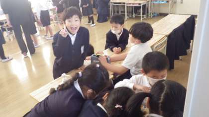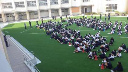 今日はたしなん祭りです。たてわり班で準備してきたことを今日はみんなに楽しんでもらう日です。最初にお店準備をしてからサブグラウンドに集合して、始めの会をしました。