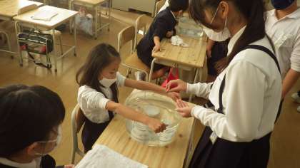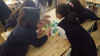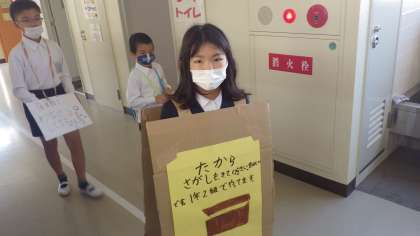 始めの会が終わったら、いよいよたしなん祭りスタートです。たてわり班でお店の人とお客さんに分かれて、交代で楽しみます。