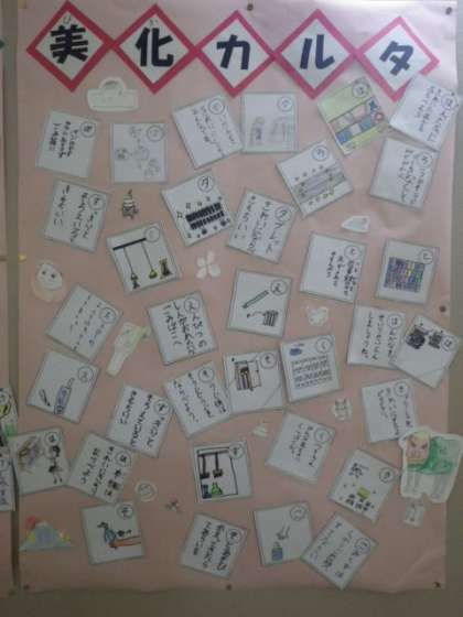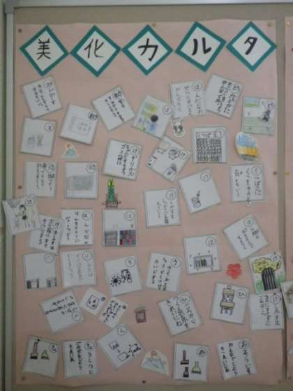 昨日の委員会活動で、美化委員会のみんなで学校・教室を美しくする「美化かるた」を作りました。職員室前の掲示板に掲示しています。どんなかるたがあるか一度見に行ってみてほしいと思います。