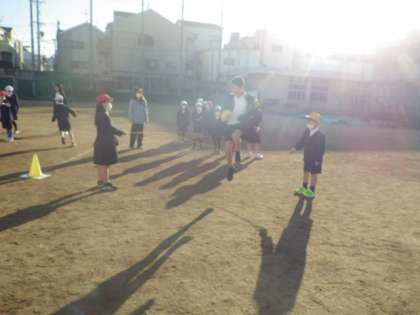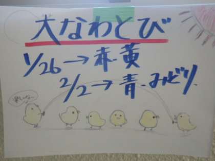 大なわとびの様子です。あまりやったことがない人もいましたが、しばらく練習していると、上手に通り抜けたり、跳べたりできるようになって、楽しく活動できていました。