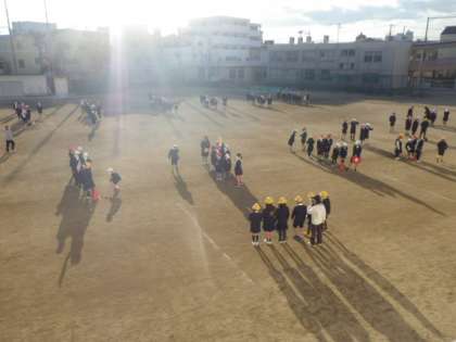 今日の児童集会は運動場で赤と黄色グループが大なわとび、青と緑グループが体育館でカルタをしました。