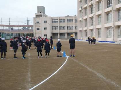 今回の児童集会は、先週と入れ替わって赤・黄グループがカルタ、青・緑グループがおおなわとびをしました。
