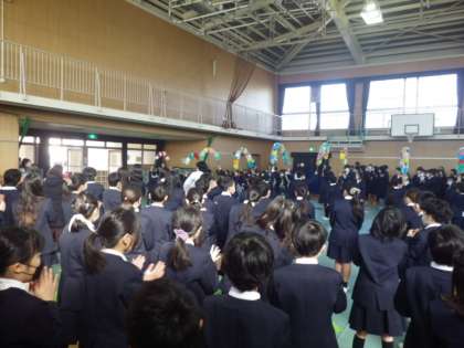 運営委員会の皆さんが司会を務め、在校生からの歌や発表で6年生の卒業をお祝いします。6年生からは歌とダンスのお礼の出し物がありました。