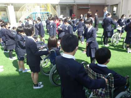 グループで声を掛け合いながらコースを回っていきます。乗る人と押す人の信頼関係が大事になることを教えてもらいました。体験の始めと終わりは「よろしくお願いします」「ありがとうございました」とあいさつをして、信頼関係を深めましょうと、お話がありました。