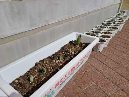 11月に生野区人権擁護委員の方々と一緒に植えたチューリップの球根も春の暖かさが増すにつれ、芽を出してきました。入学式あたりにはきれいに咲いている予定です。