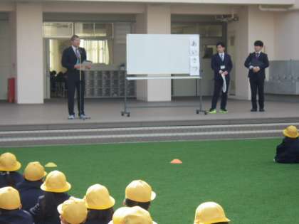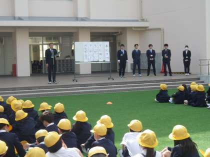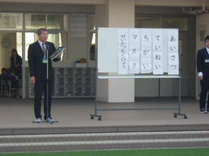 次に生活指導の先生方から、年度初めの学校生活についてのお話をしていただきました。大事にしてほしい5つのこと「あいさつ」「ていねい」「ちがい」「マスク」「せいかつもくひょう」についてのお話がありました。