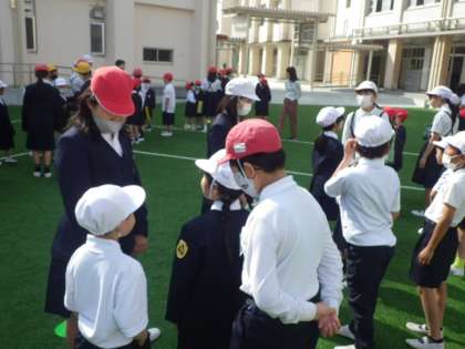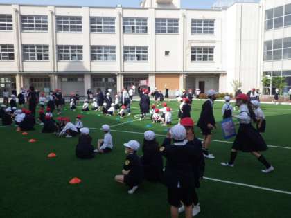 自己紹介の後は、6年生が散らばって、同じ班の6年生を探すゲームをしました。それからごろごろドカンやしりとりドカンをしました。